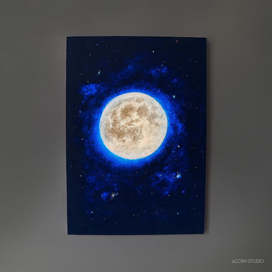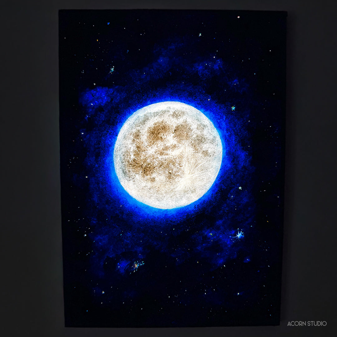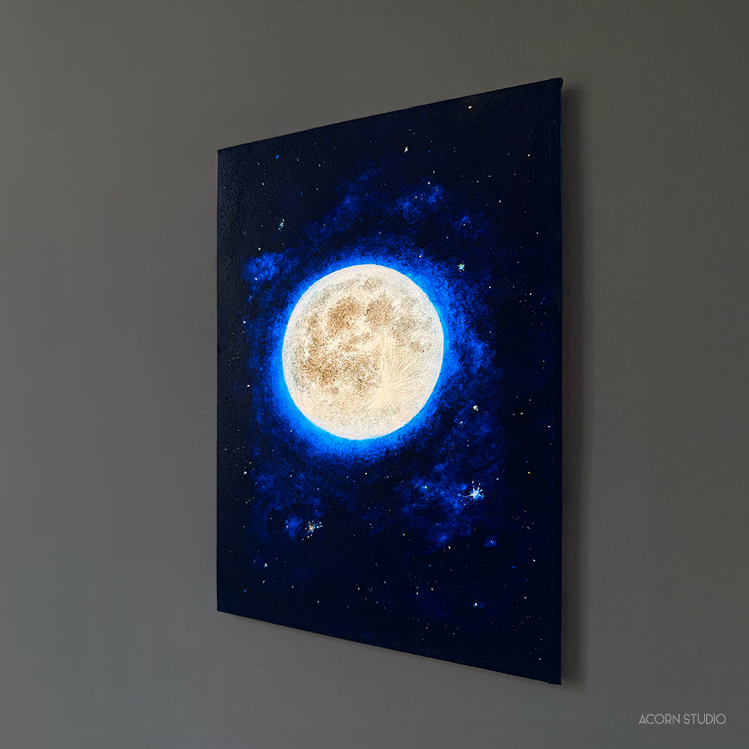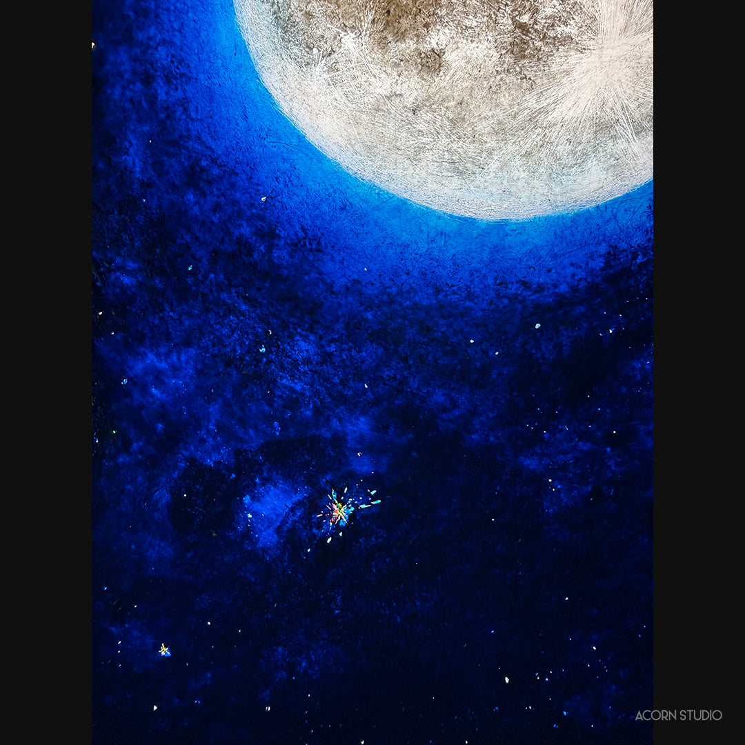 作品以壓克力光板為媒材,光在畫面中並非被描繪的對象,而是作品本身的結構——透過內在光源呈現天體,使星月彷彿誕生自畫面其中,構築出一個宇宙與內心相會的冥想空間。