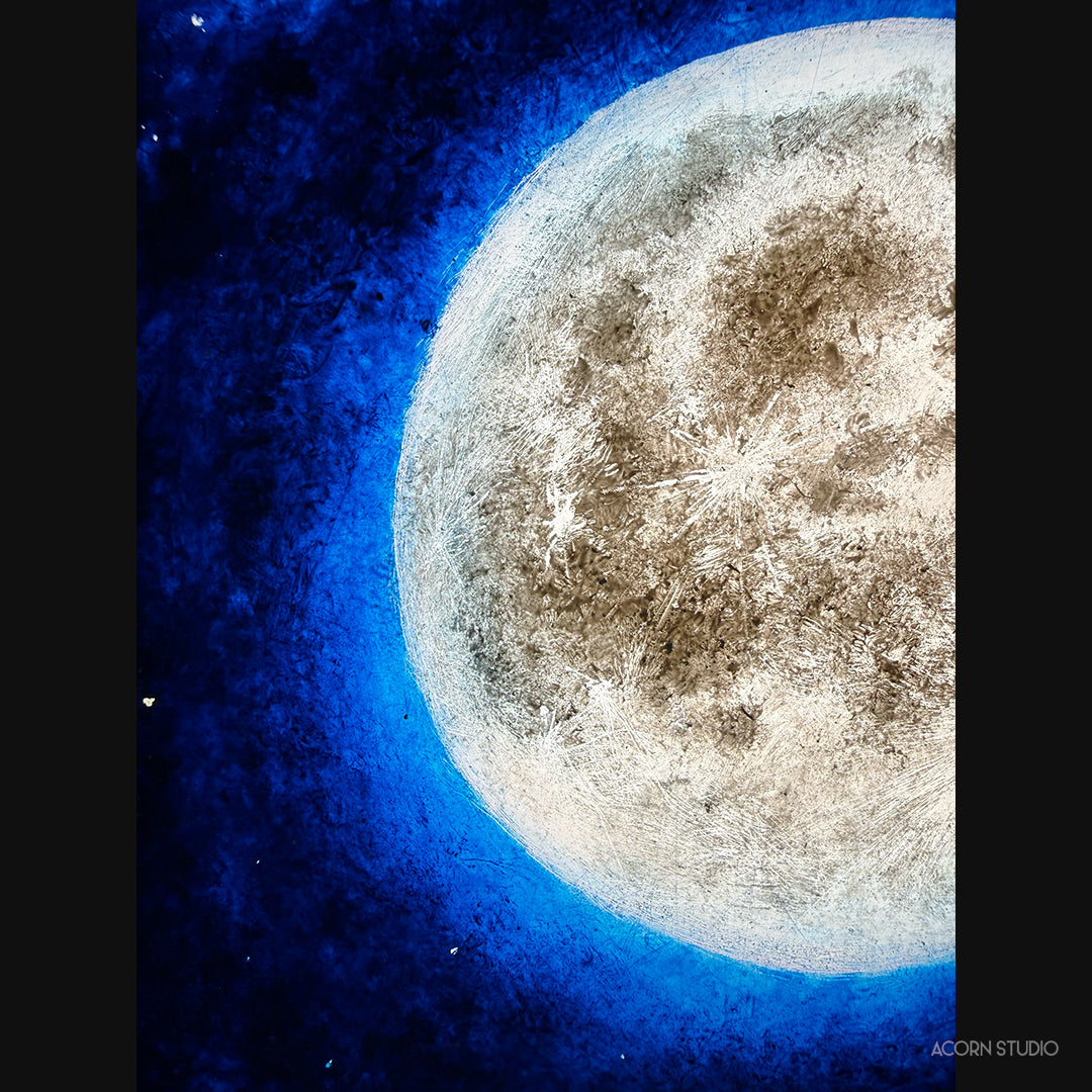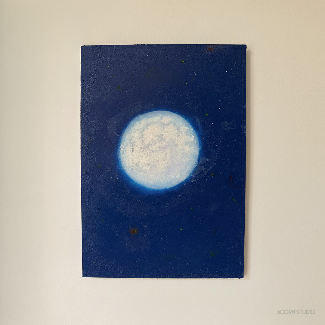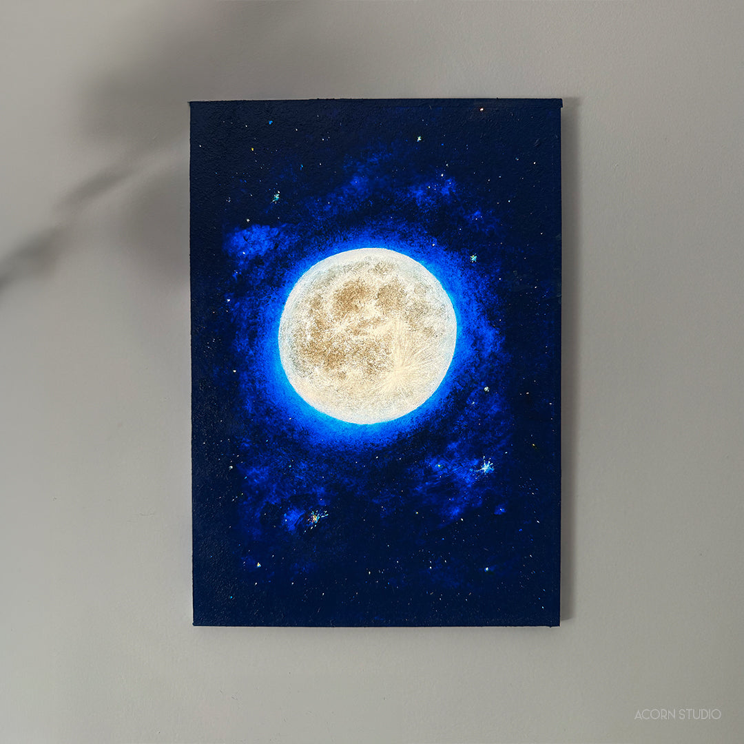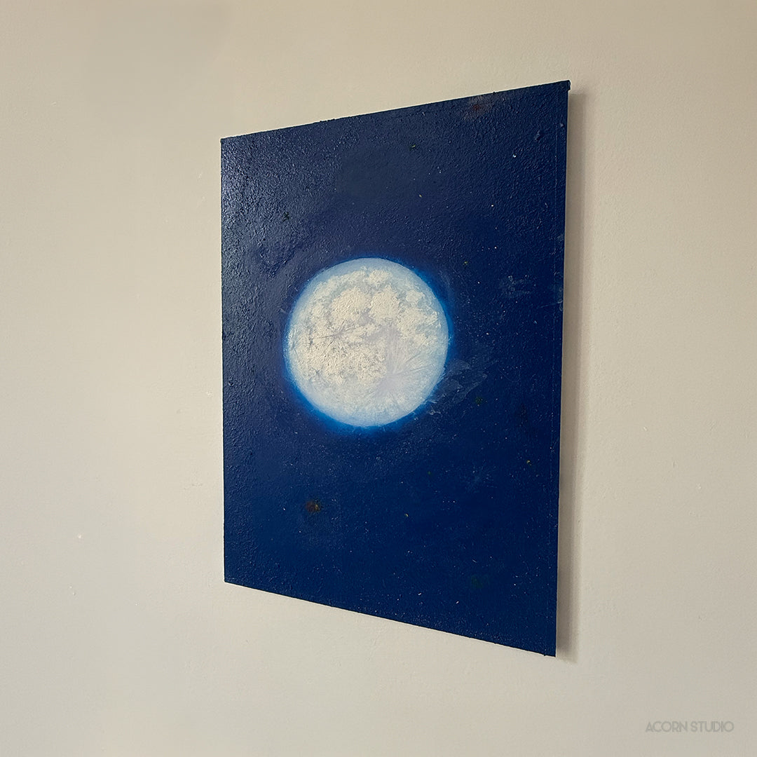 作品以壓克力光板為媒材,光在畫面中並非被描繪的對象,而是作品本身的結構——透過內在光源呈現天體,使星月彷彿誕生自畫面其中,構築出一個宇宙與內心相會的冥想空間。